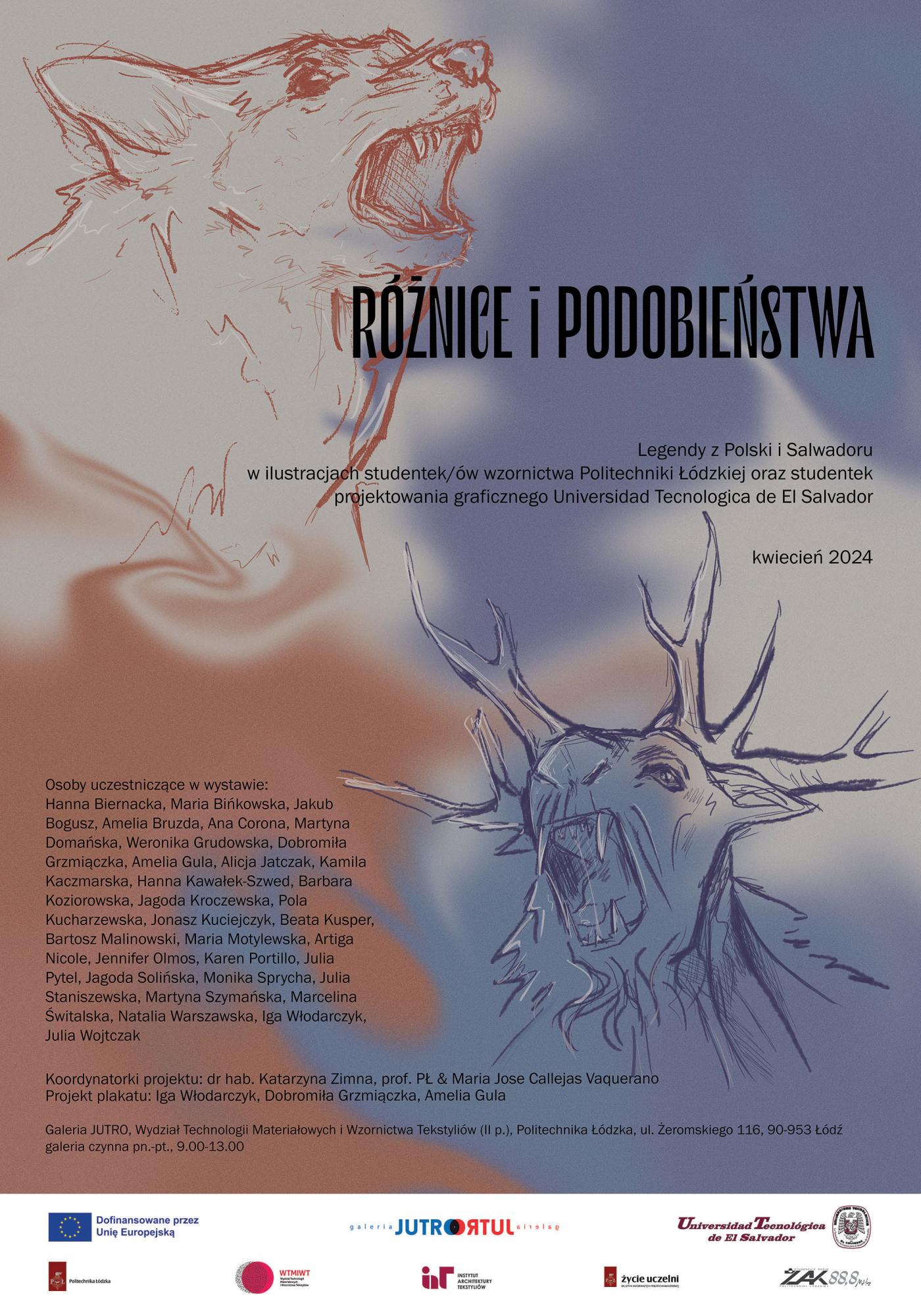 RÓŻNICE i PODOBIEŃSTWA / DIFERENCIAS Y SIMILITUDES. Legendy z Polski i Salwadoru w ilustracjach studentek/ów wzornictwa Politechniki Łódzkiej oraz studentek projektowania graficznego Universidad Tecnologica de El Salvador; kwiecień 2024; fiesta en la exposición: czwartek 11.04.2024 r., godz. 11.00
